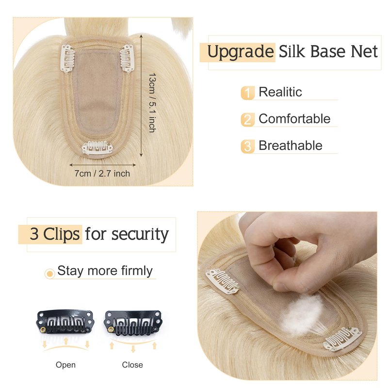 - ♛Realistic Silk base coverage Toupee♛ Topper with silk base has the most natural appearance compared to other like products.It can barely be told from real human scalp even through close observation.No one can find your secret. Base size: 7 cm x 13 cm(2.7”x5.1” approximately).