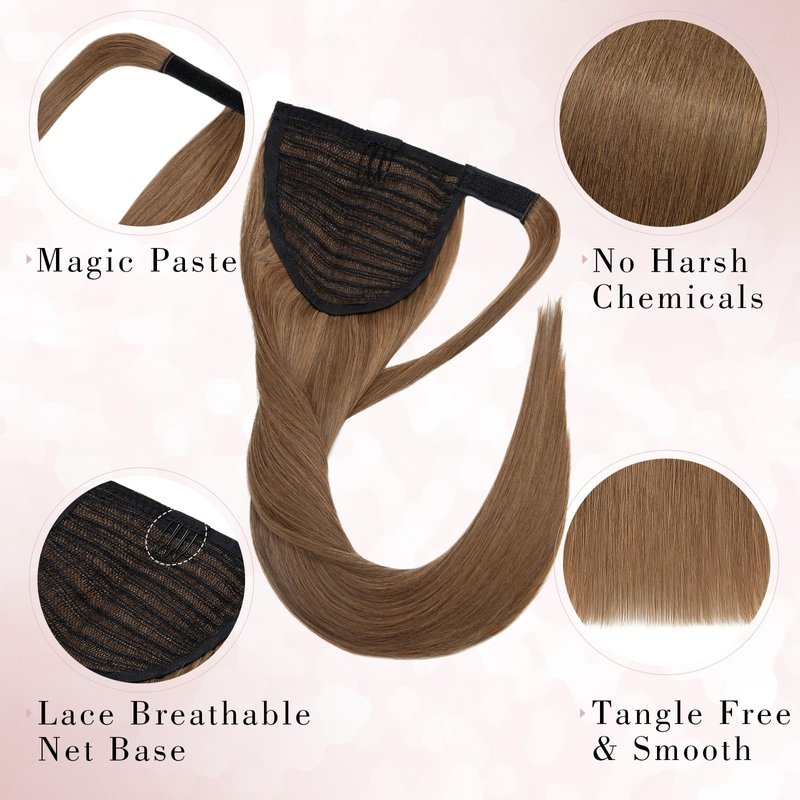 - 【Easy to use】Wrap Around Ponytail Hair Extensions: With magic paste and clip-in comb design, the ponytail can be easily fixed. Just wrap the hairpiece around ponytail and use bobby pins to secure it, easy and undetectable. No one will find your secret.