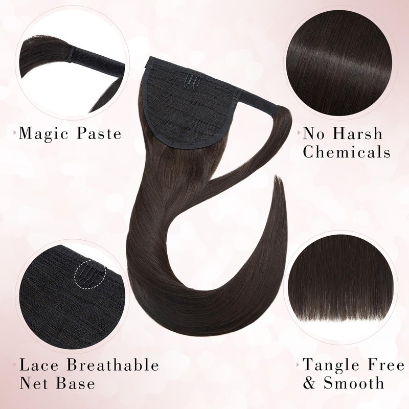 SEGO Pro Ponytail Extensions Human Hair Long Straight Ponytail Hair Extensions with Magic Paste Wrap Around Clip in Ponytail Extensions Real Human Hair,14inch #2 Dark Brown,80g