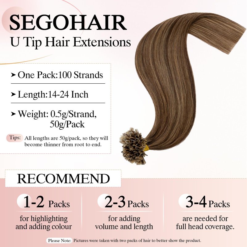 Product Details: Type: SEGOHAIR U Tip Hair Extensions Application Methods: Keratin U-Tip Materials: Human Hair Texture: Straight Length: 14-24 Inch Weight: All lengths are 50g/pack, so they will become thinner from root to end. Hair Color: Same as Picture Recommendation: 1-2 Packs for creating highlights and adding colour. 2-3 Packs for adding volume and length. 3-4 packs are needed for full head coverage.