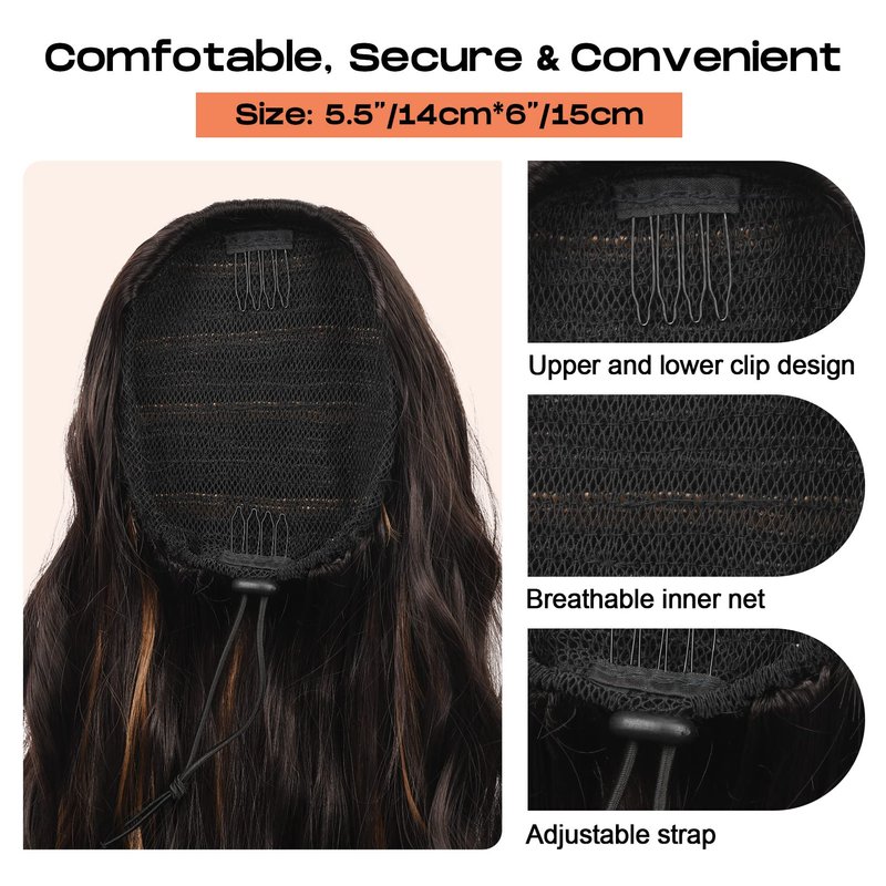 - 💖Easy to Apply - Just put your own hair in a high tight bun, pull the drawstring tight for a secure fit. The drawstrings themselves can be hidden by tucking under the base. It takes less 1 minute to put our clip in ponytail hair extensions into your hair and is effortless!