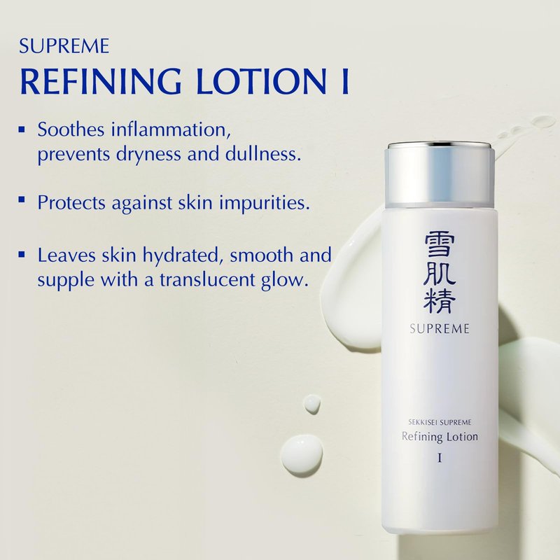 - Sekkisei Supreme Refining Lotion I. Helps to soothe inflammation, prevents dryness and dullness, and protects against impurities. Leaves skin hydrated, smooth and supple with a translucent glow