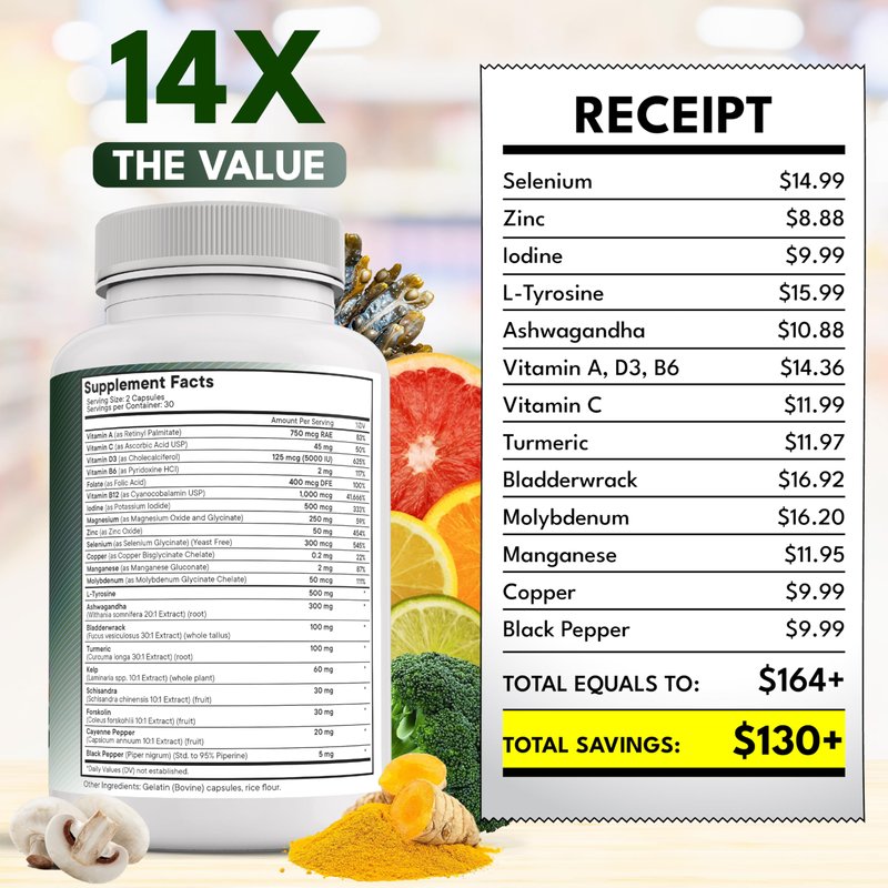 Selenium, Zinc, Iodine, L Tyrosine, Ashwagandha - Thyroid Support Supplement for Women and Men with Bladderwrack, Turmeric, Silica Kelp, Schisandra - 60 Count