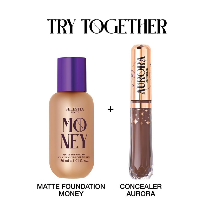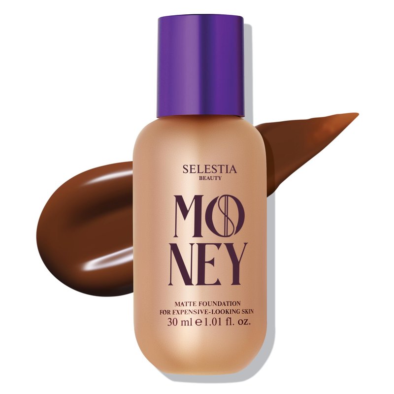 The main secret of perfect matte expensive-looking skin is highest rated makeup from Selestia Beauty. Flawless coverage and smooth, even skin, weightless texture, amazing matte finish, and unmatched durability. The Money water based foundation flawlessly hides all imperfections and leaves no chance for an oily sheen. The silky soft texture of foundation for mature skin and young skin glides on and spreads over the skin for a natural finish without a mask effect. 8 shades for different skin types: 01 Ivory - Ivory with beige undertone, 02 Vanilla - Nude beige with golden Undertone, 03 Cloud - Beige with peach undertone, 04 Almond - Medium beige with sand undertone, 05 - Honey - Medium deep with warm undertone, 06 - Caramel - Medium deep or light tan skin tones with yellow undertone, 07 - Mocha - Deep skin tones with yellow undertone, 08 - Truffle - Deepest skin tones with neutral undertones.