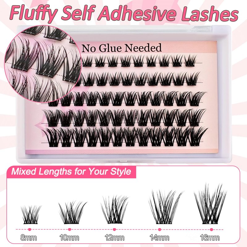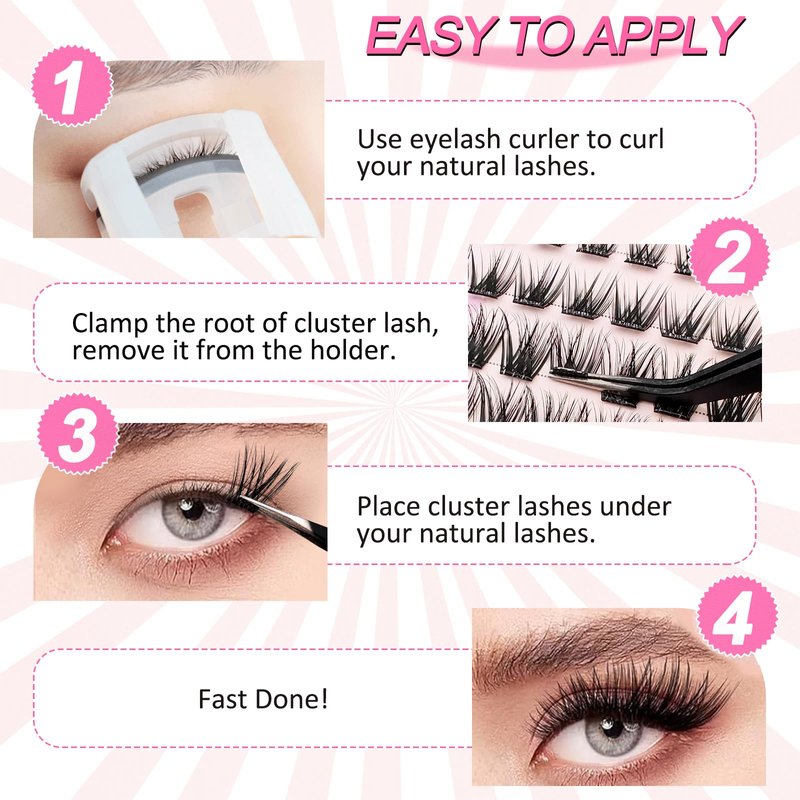 - Self Adhesive Eyelashes: The self adhesive lashes clusters kit contains 60 pcs pre glued lashes, eyelash curler and lash tweezer. No need for extra glue or waiting for it to dry, just use tweezers to place the cluster lashes under your natural lashes.