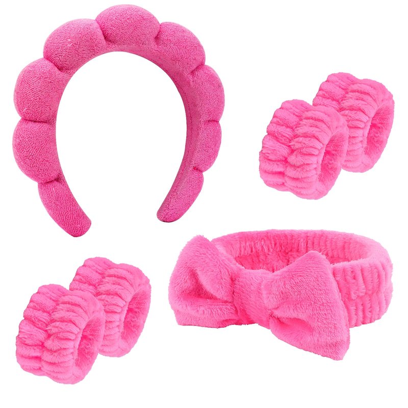 Semato Spa Headband and Wristband Set Skin Care Headband Fluffy Bow Face Wash Headband Hair Accessories Bubble Sponge Spa Headband for Women and Girls (hot pink)