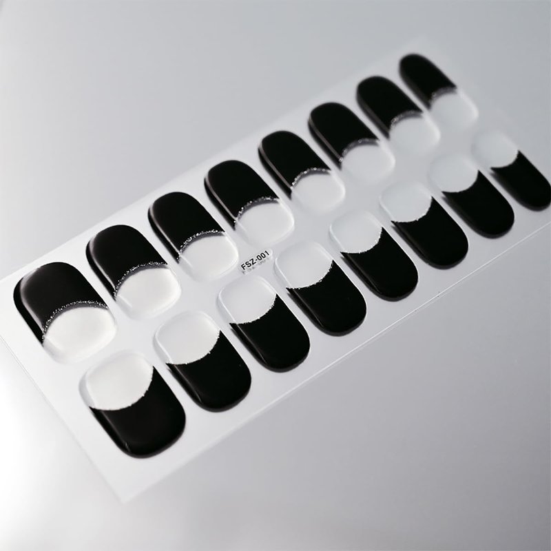 Semi Cured Gel Nail Strips French Tip Nail Polish Strips Self-Adhesive Gel Nail Black French Nail Polish Stickers 16 Pcs Glitter Gel Nail Wraps for Women Girls Manicure Nail Decoration