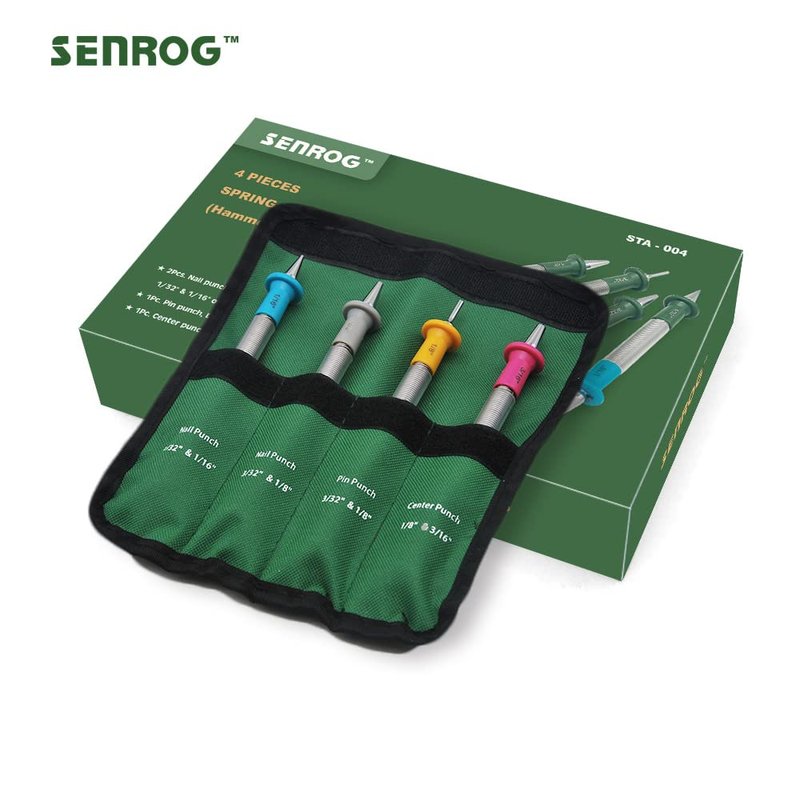 SENROG 4-Pieces Spring Tool Set,Nail Punch:1/32", 1/16", 3/32", 1/8" Spring Loaded Nail Set, 3/32", 1/8" Pin Punch, 1/8", 3/16" Center Punch Spring Punch Tool-4 Pcs(Nail & Pin & Center Punches)