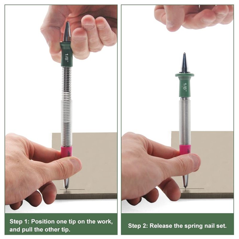 - Spring Tools Include: The spring nail punch includes 2 pcs-Dual head spring nail set center punch 1/32"&1/16" heads and 3/32"&1/8" heads, 1 pc-Dual head hinge pin punch setter 3/32"&1/8" heads, 1 pc-Dual head center punch setter 1/8"&3/16" heads in a bag. Each nail punch tool is distinguished by a different color, making it easier for users to identify each tool.