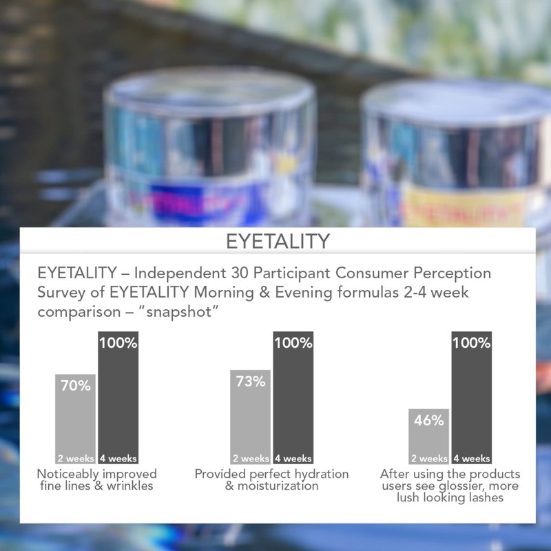 Eyetality PM Total Eye Care is a night-time eye treatment formulated with Resveratrol and Peptides for recovery and regeneration of the skin in the eye area. This luxuriously rich cream features targeted eyelash optimizers to help improve lash length, fullness, and thickness while you sleep. Apply every evening to replenish hydration and optimize he snap and elasticity to the delicate and impressionable skin surrounding the eyes.