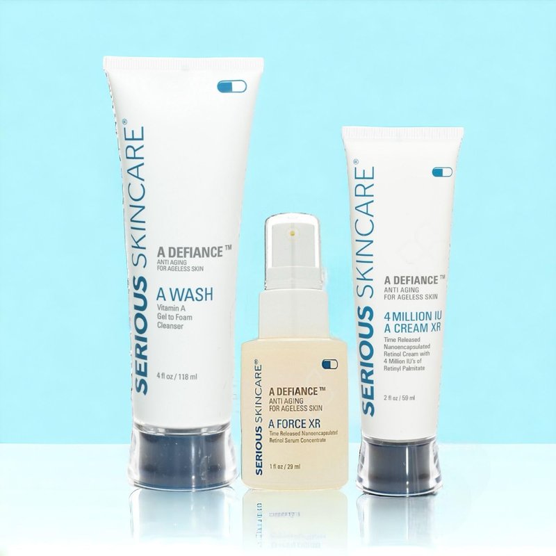 Serious Skincare’s Age Defiance skin care products for Ageless Skin fights the appearance of fine lines and wrinkles. Skin exfoliating Retinol, AHA's, peptides and natural botanical extracts help reveal an illuminated, more even-looking complexion. Our A Defiance lightweight and non-greasy formulas are formulated with skin exfoliating Retinol, AHA's, peptides and natural botanical extracts that help soften and smooth the skin. The A Defiance Face and Neck Trio includes one each of our A Wash Gel-to-Foam Cleanser 4 oz, A Force XR Serum Concentrate 1 oz. and 4 Million IU A Cream 2 oz., the ideal skin care regime for a smoother, softer and more youthful appearance.