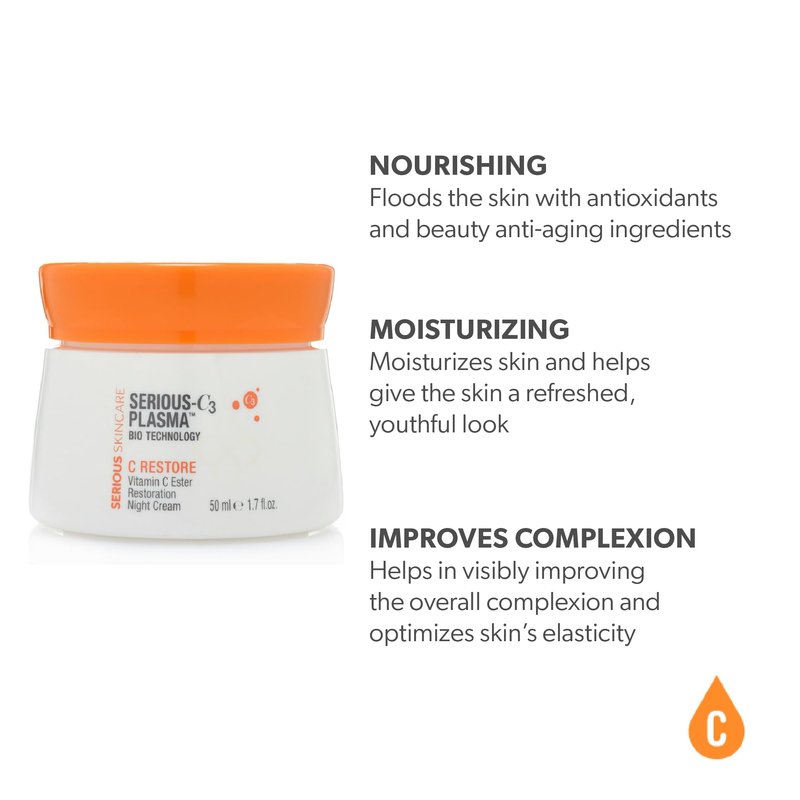 - C-RESTORE Vitamin C Ester Night Cream – Our rich nighttime moisture cream is designed to hydrate, smooth and optimize the look of your skin. Our Night Trio includes one 1.7 oz C-Restore.