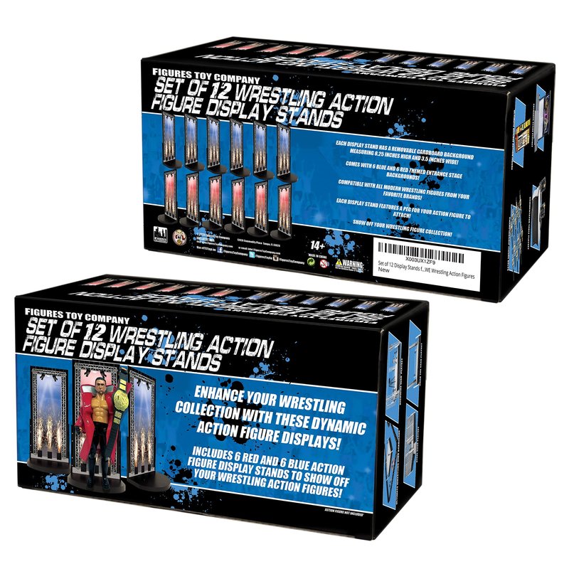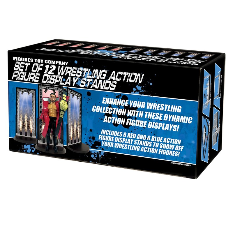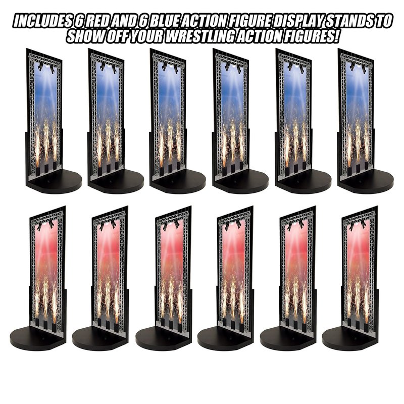 Put all the attention on your favorite wrestling figures when you pose them on our new Display Stands! Standing at over 8 inches high, our new stands feature a spotlight and pyro entrance design in both red and blue. You also won't have to worry about figures falling over, because the display base has a 3mm peg support to keep your figures standing tall! Each set contains 6 blue and 6 red display backgrounds and 12 bases. Each stand measures 3.75 inches wide and the cardboard insert is 8.5 inches tall. Display stand is in two pieces so you can use just the base as well. Compatible with all wrestling action figures. Will also work with other 6-8 inch action figures. Don't let another figure fall over...set up your shelf with our new Display Stands today!