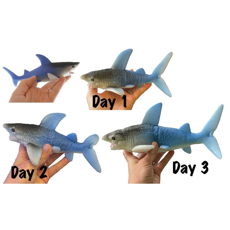 - Place it in water and it will slowly grows way bigger! Full sized shark is about 11" x 5.5" x 5" after about 24 hours. Full sized lizard is about 19" x 6" x 2.75" after about 24 hours. Full sized frog is about 7" x 6" x 1.75" after about 24 hours.