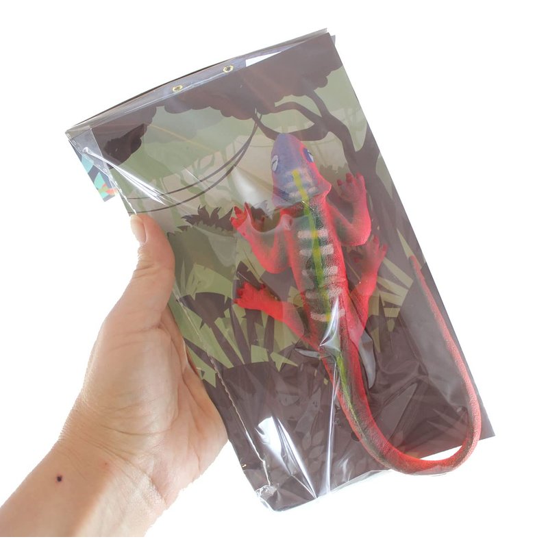 - The shark is 6.5" long and 3.5" wide out of the package. The reptile is 12" long and 2.5" wide out of the package. The frog is 3.5" long and 3.75" wide out of the package.