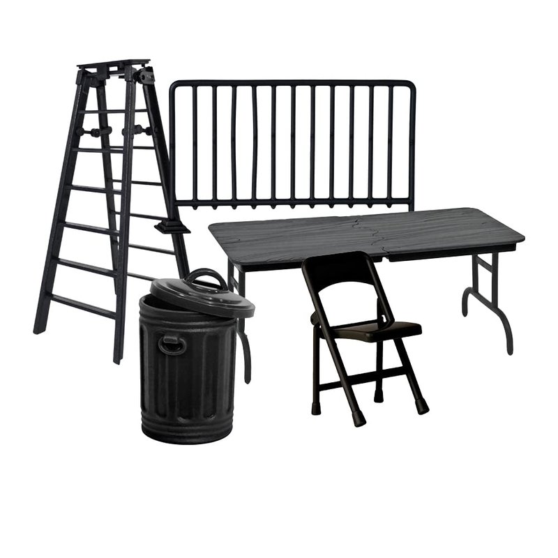 Elevate your wrestling action figure battles with this set of 5 solid black accessories, designed to bring the intensity of the ring to your collection. The set includes a sturdy ladder for high-flying maneuvers, a foldable chair for devastating strikes, a breakable table for epic slams, a guardrail to keep the action contained, and a trash can to add gritty realism to every match. These versatile and detailed pieces are perfect for creating unforgettable moments and enhancing your wrestling figure display with an authentic, battle-ready atmosphere. Compatible with all wrestling action figures. Also a good scale for other 6-8 inch action figures.