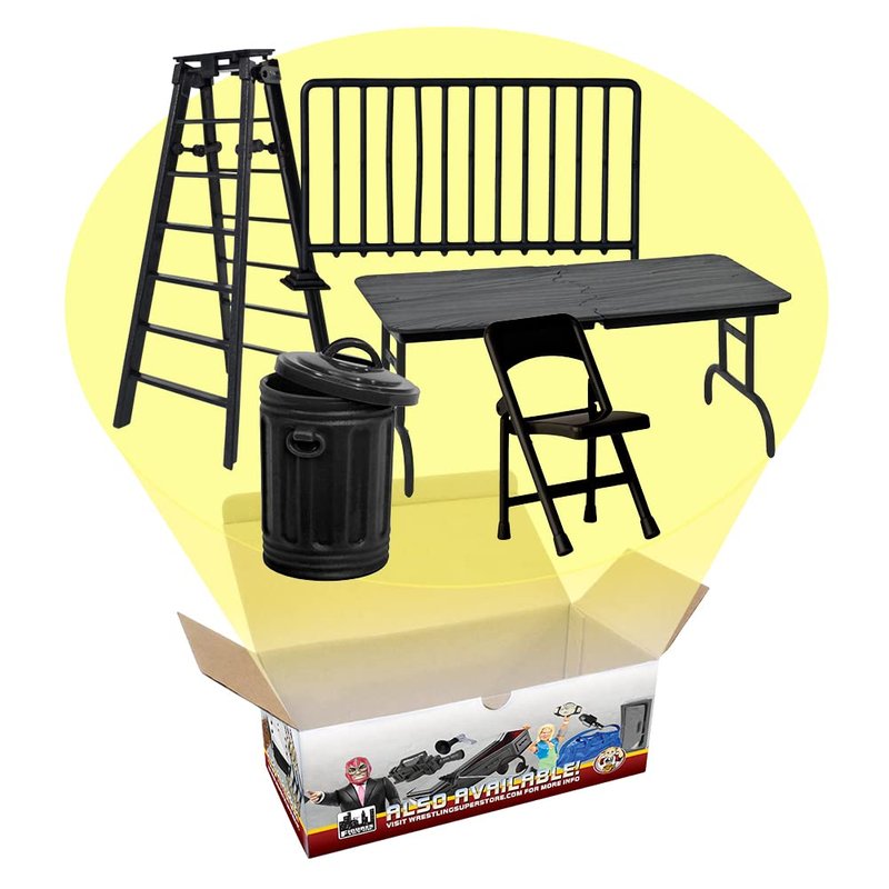 - The set includes a sturdy ladder for high-flying maneuvers, a foldable chair for devastating strikes, a breakable table for epic slams, a guardrail to keep the action contained, and a trash can to add gritty realism to every match.