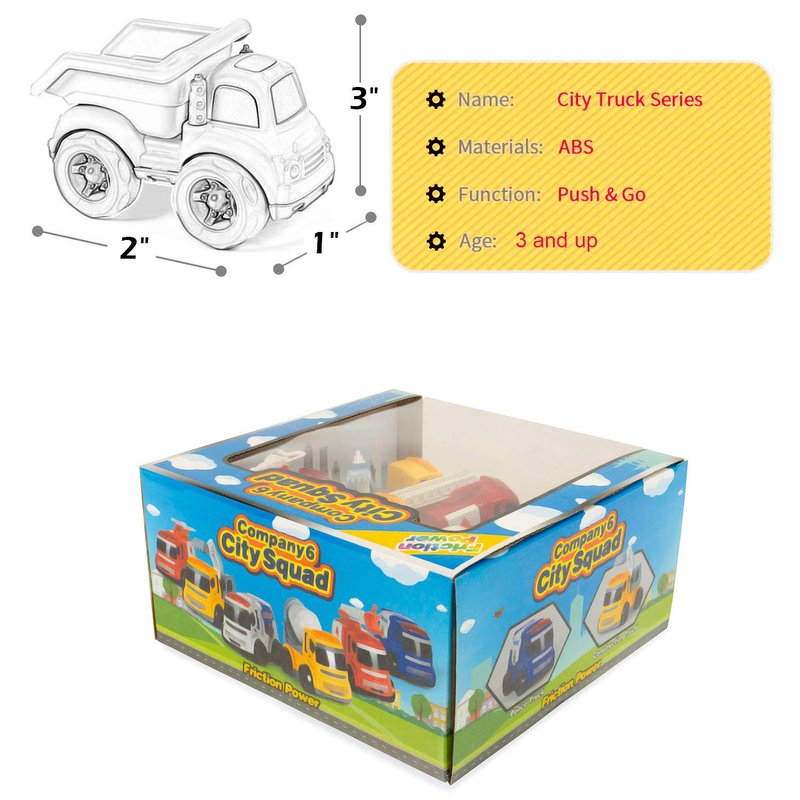 - 【Push and Go】Each truck is friction powered, and does not require batteries. The trucks are quite powerful, they can go a long distance with just a slight push, can be used indoors or outdoors on flat surface. Exercise your kids fine motor skills, hand-eye coordination, imagination and more.