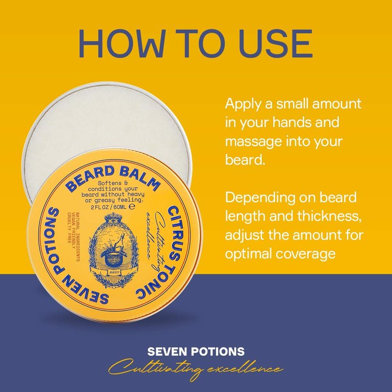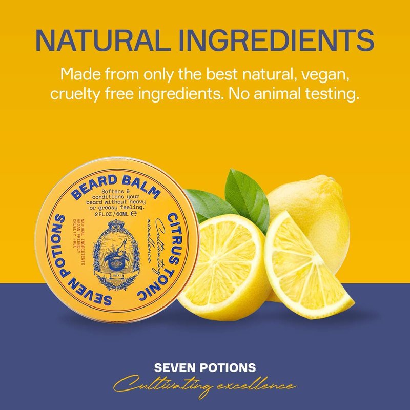 SEVEN POTIONS Beard Balm for Men — Conditioning Beard Softener to Nourish Skin, Facial Hair, and Stop Beard Itch — All-Natural, Vegan, Cruelty Free — Citrus Tonic (2 FL OZ)