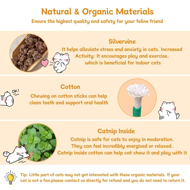- Christmas Gift for Cat, Lifetime Warranty: 100% Natural Toy for Cats. SEVENKA silvervine cat chew toys are made of 100% natural, organic silvervine fruit, cotton and catnip. This cat nip toy is not only safe & healthy, but also a funny catnip rope toy for bored indoor cats