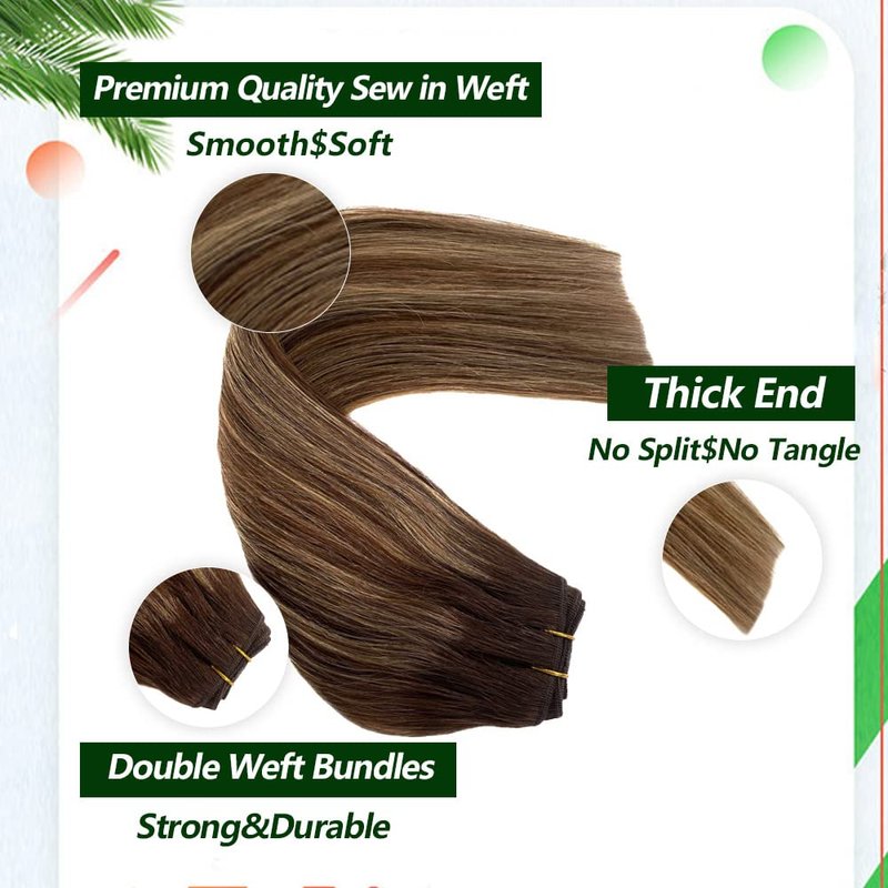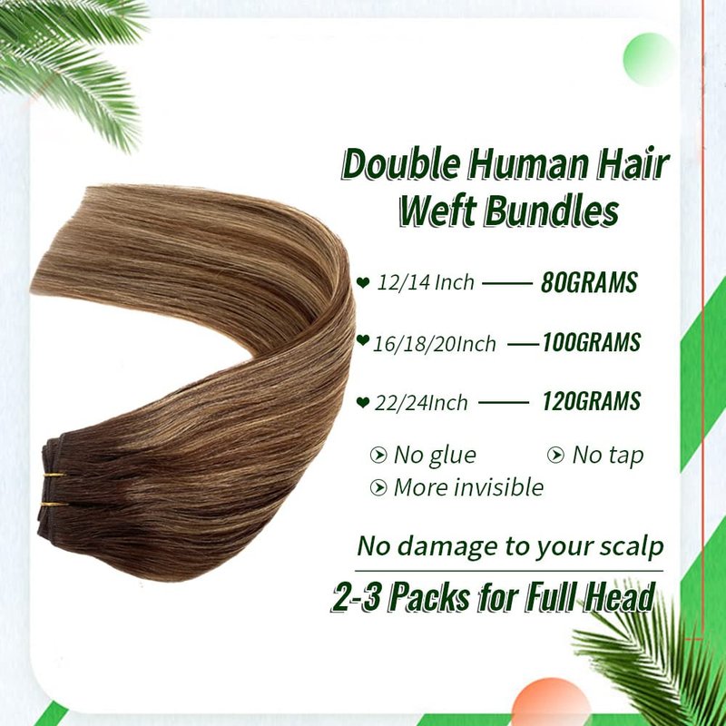 Sew in Weft Hair Extensions Human Hair, Brown to Golden Brown with Blonde Highlights Human Hair Sew in Extensions, Hand Tied Wefts Human Hair Ombre Sew in Hair Extensions Real Human Hair 12inch 80g