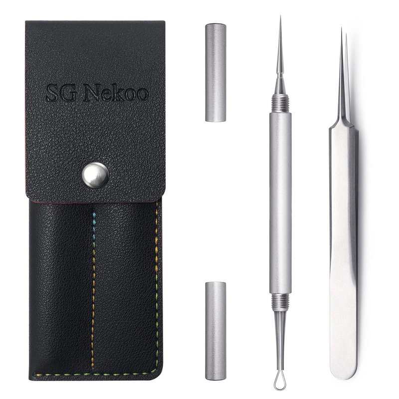 - TWO TOOLS IN ONE KIT: One is double end needle with circle loop & sharp tip, one is sharp tweezers; And comes with exquisite PU leather case; Great set for facial care; Made of high grade material, can be used for both normal skin or allergic skin, please disinfect with boiling water or alcohol before use;