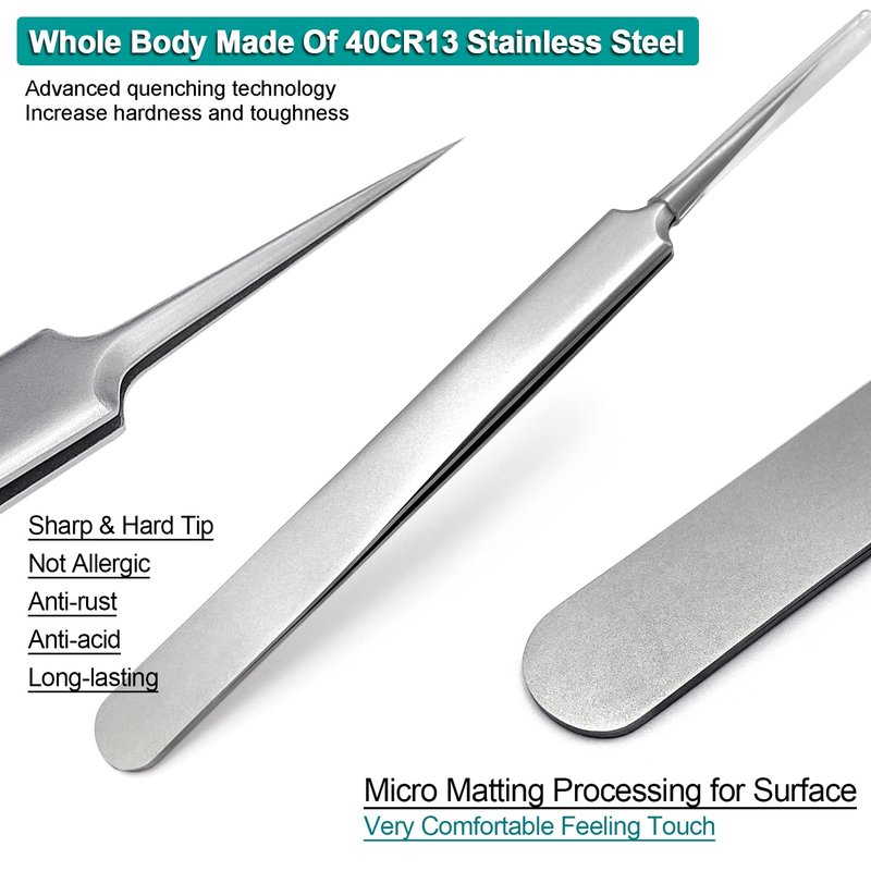 - SURGICAL GRADE TWEEZERS: Made of surgical grade 40CR13 stainless steel, 4.61inches; long stay sharp and sturdy; Micro matting surface and very comfortable feeling touching;