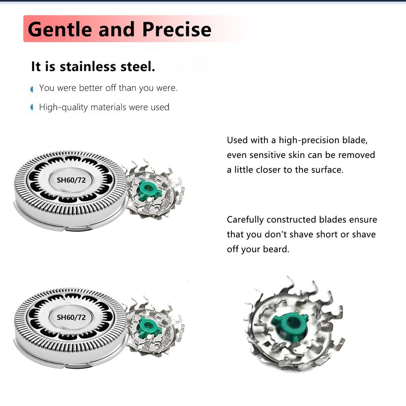- [Comfort shave]:Blades for philips norelco series 6000 replacement heads whoes rounded edges move smoothly over skin for a protective shave,for norelco sh60/72 replacement heads, get a comfortable dry and wet shaving experience.