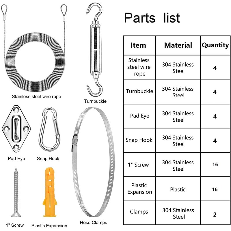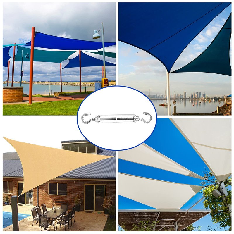 - Top Grade Quality: This patio sun shade kit is made of high-quality 304 /18-8 stainless steel which is extremely durable, sturdy, and rust-proof. With high load carrying capacity and long service life. 6 to 8.5 inch adjustable turnbuckles to create a proper amount of tension, making your shade sails more stable, effectively preventing the sun shade sail from being blow away by rapid winds in bad weather.