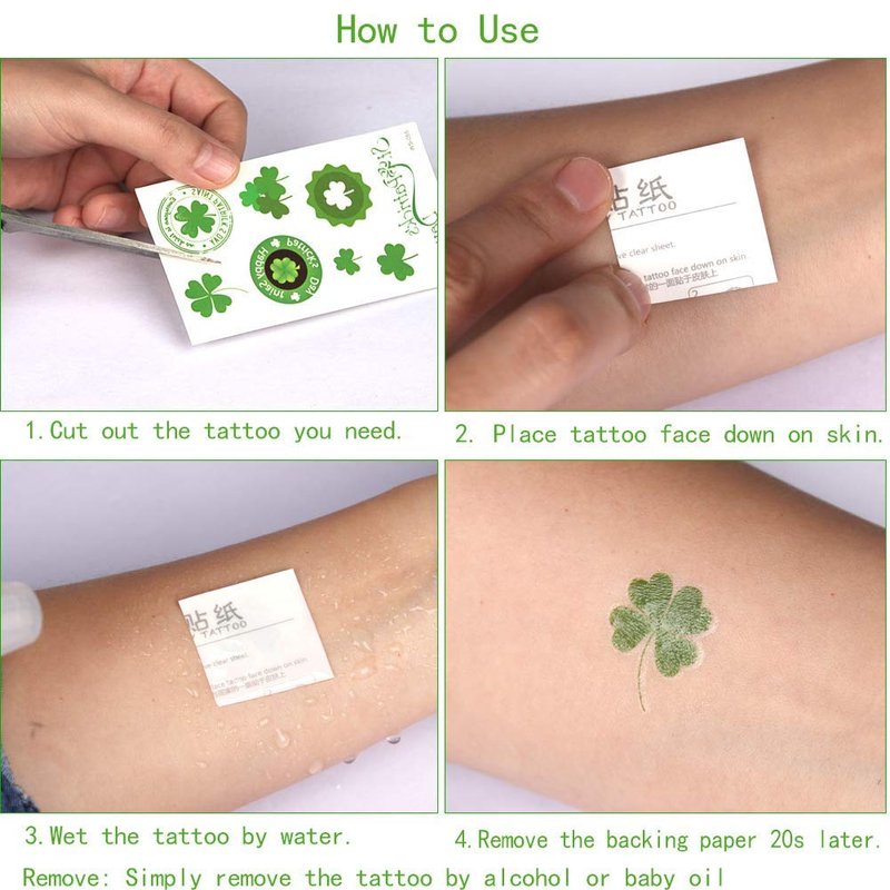 - Easy to use and Remove: These shamrock temporary tattoos for St Patricks Day are super quick and easy to use, just 10-20 seconds with water transfer, and our tattoos is removed easily by baby oil.
