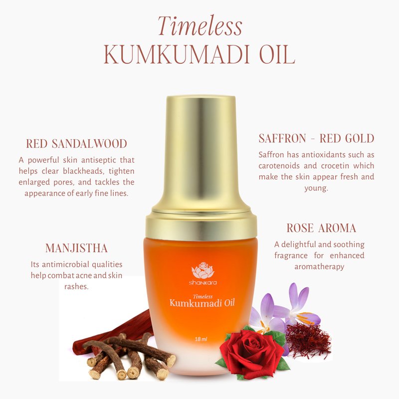 - Experience the Magic of Ayurveda for Beautiful Skin – Shankara’s Timeless Kumkumadi Oil is a renowned skincare solution that harnesses the natural power of red-gold saffron and a potent blend of 32 deeply nourishing flowers and ayurvedic herbs. Infused with the extraordinary benefits of lotus and turmeric, this exquisite formula offers unparalleled skin-transforming properties that will leave your skin radiant and revitalized!