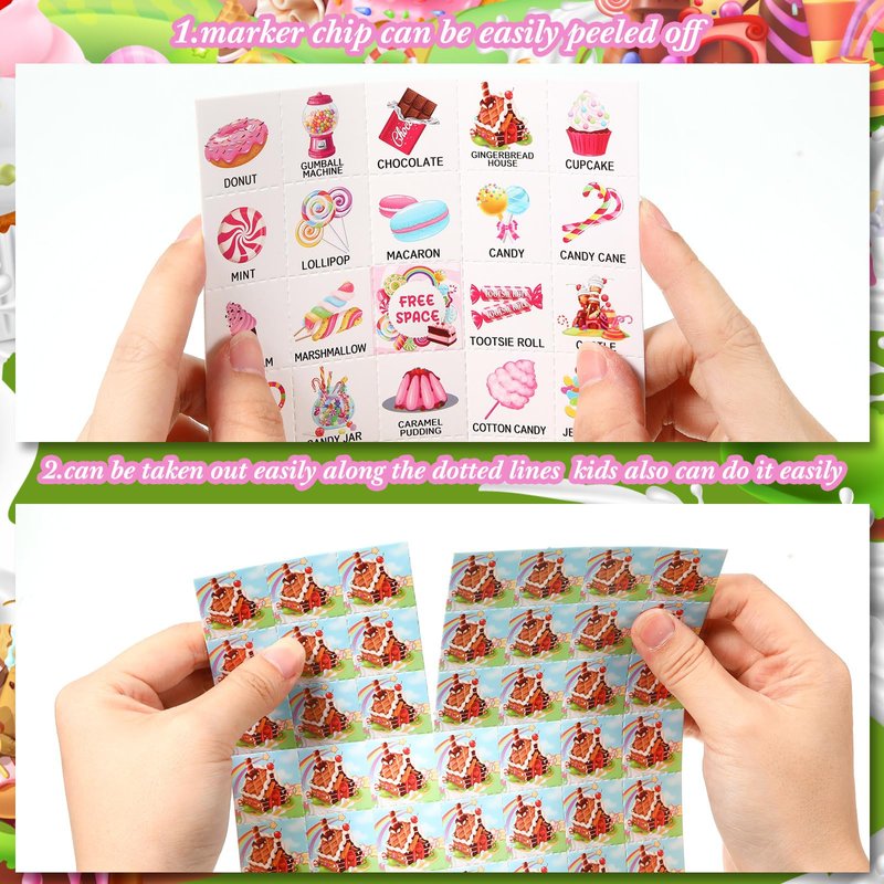 - Easy to Play: these candyland party favors are easy to learn and simple to play. With dotted lines on the chip and caller card, playing the game is easier than ever. Simply choose a caller, cut the bingo marker paper into pieces, then you and your guests are ready to play and enjoy the party in no time