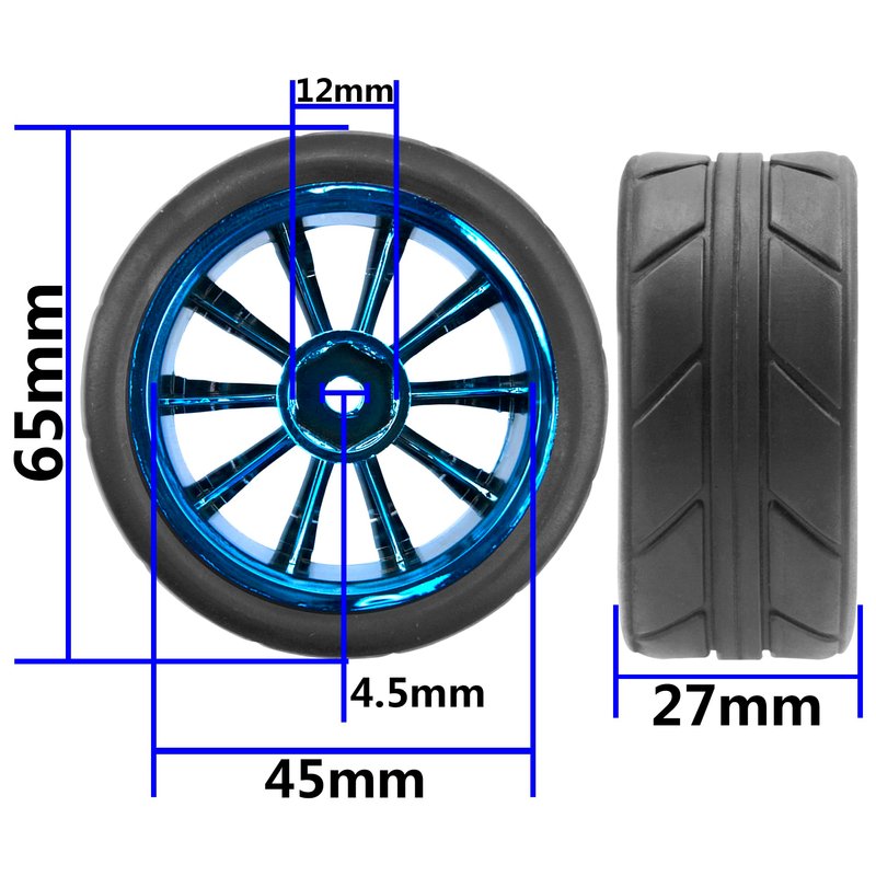 - Tire Outer Diameter: 65mm/2.55",Tire Width: 27mm/1.06"; Rims Inner diameter: 45mm/1.77" ;Wheel Drive Hex: 12mm; Axle Hole Diameter: 4.5mm; Color: Blue/Silver(Optional);Check the size before place the orders.