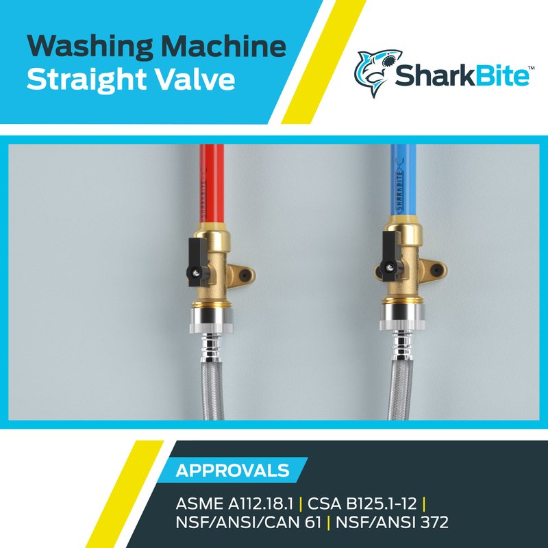 - SHARKBITE BRASS PUSH WASHING MACHINE VALVE: The SharkBite washing machine straight valve can be used in washing machine installations with no washing machine outlet box; ideal for working in tight spaces