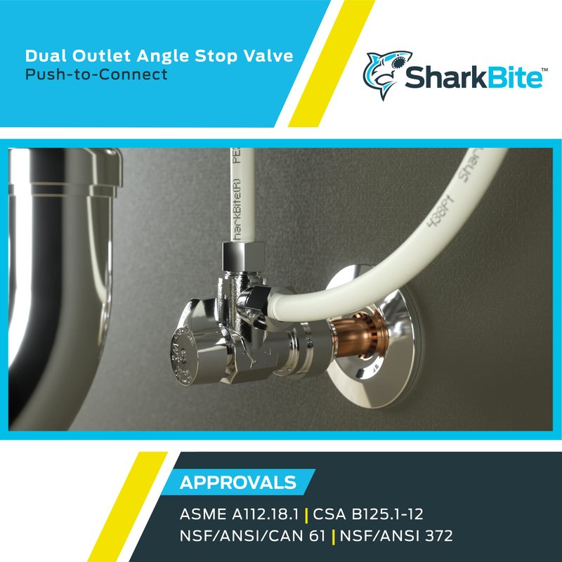 - SHARKBITE BRASS PUSH DUAL OUTLET ANGLE STOP VALVE: Brass push angle stop valves are used to control and shut off water flow to fixtures or appliances for maintenance and repair; ideal for working in tight spaces; remove using a disconnect clip or disconnect tongs