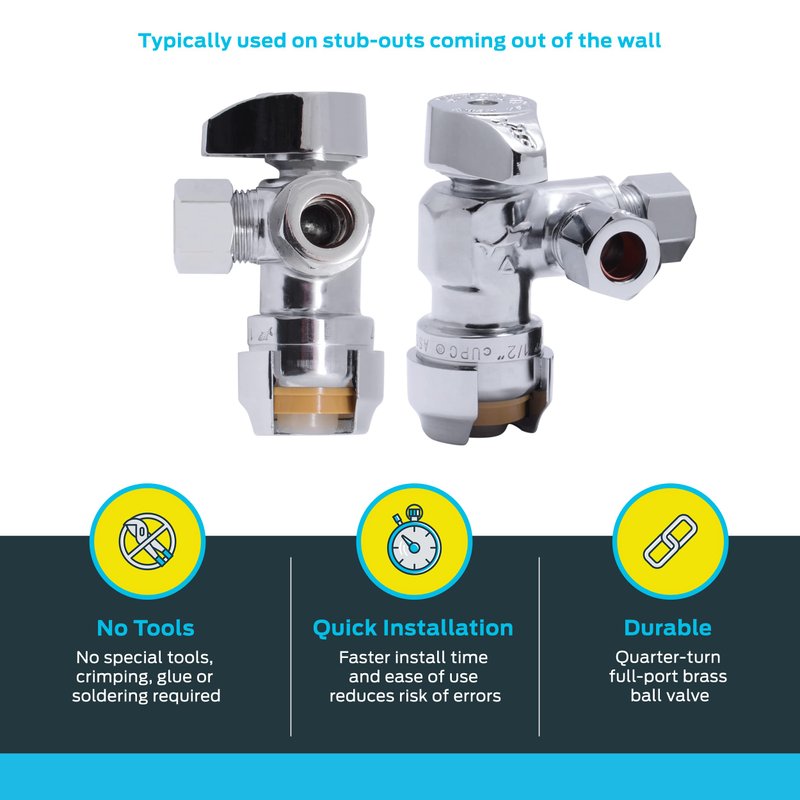 - EASY TO INSTALL: This innovative stop valve features a 1/2-inch push-to-connect inlet and two 3/8-inch compression outlets for quick installation; features a quarter-turn full-port brass ball valve for easy operation; no special tools, crimping, glue, or soldering needed; can be installed in wet lines