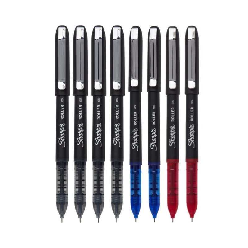 - Includes 8 rollerball pens. 4 Black, 2 Blue, and 2 Red