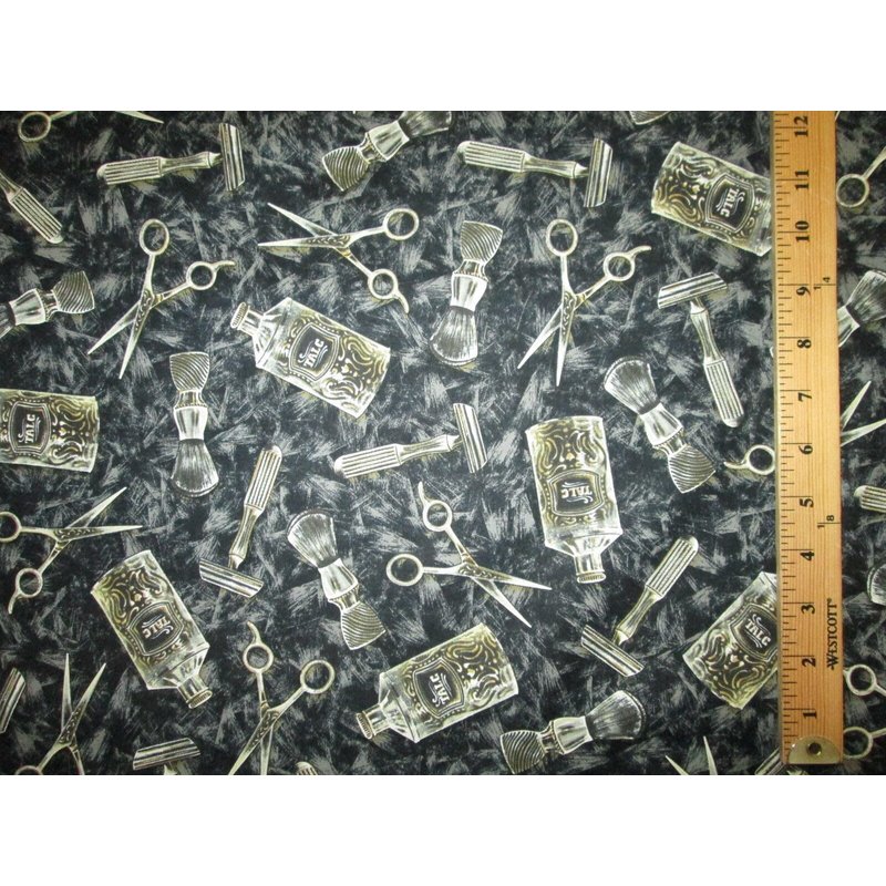 - Item Specifics: Material :cotton Lic Cotton Print Width: 22 Amount: FQ 18 Inch This is for one Fat Quarter measuring 18 by 22 inches of neat print of Men's Saving Items - including scissors, a brush, talc and more on a Black Background! This is a fun and unusual fabric