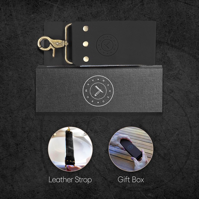 - β STROP & SHAVE - Never again endure the painful yank-and-drag agony of a dull razor. Just strop it with a Naked Armor leather strop and watch your razor's edge jump back to life.