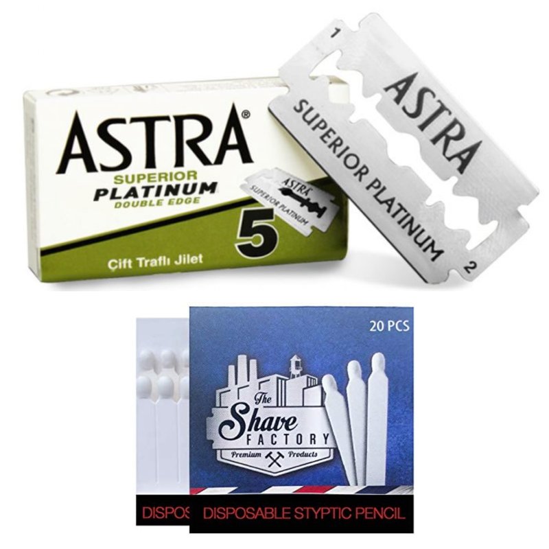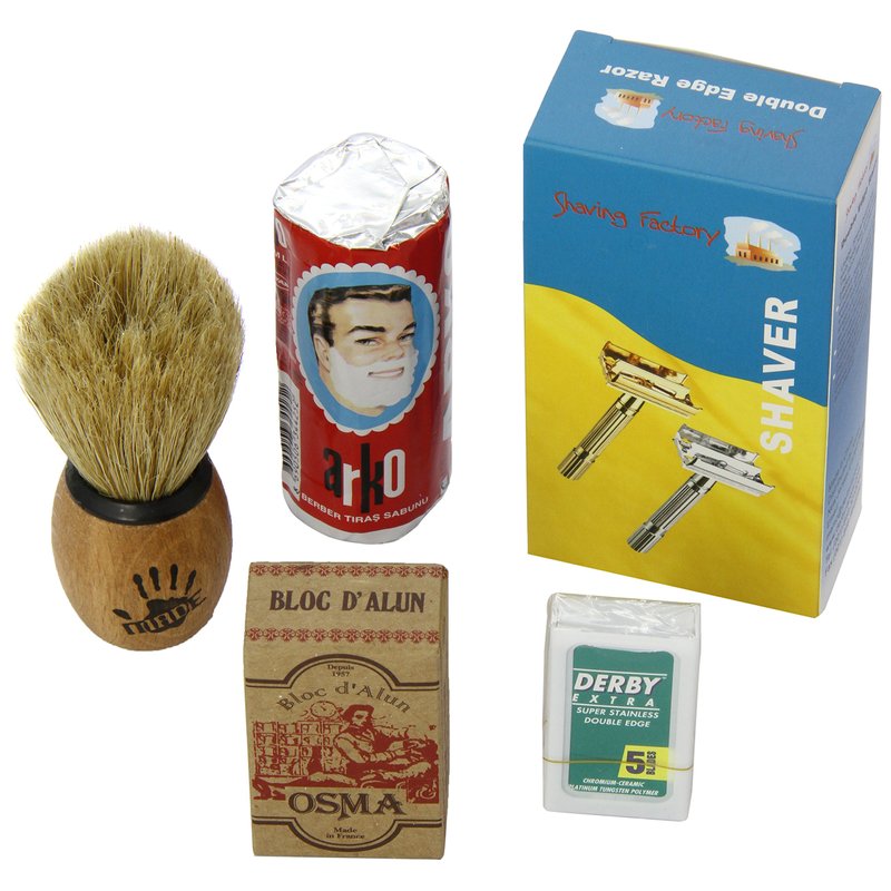 Shaving Set with Shaving Factory Double Edge Safety Razor, Alum Bloc Osma, Shaving Factory XSmall Shaving Brush, Arko Soap and 5 Derby Extra Blades.