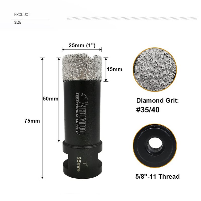 - Diameter 25mm, 5/8-11 connection, Total height 75MM, Max working depth 50mm, Diamond height 15MM