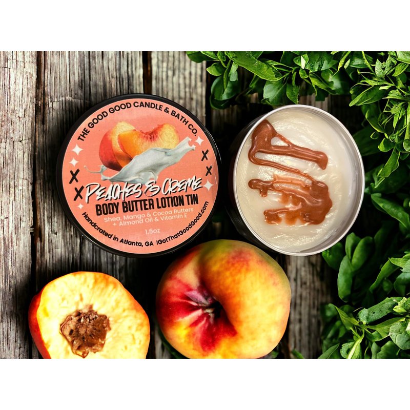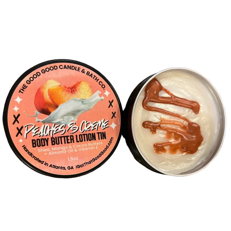 Crafted with love, our pure body butter bars are made from the most super ingredients on earth. Trendy & ultra moisturizing, our bars are a creamy & dreamy combination of Shea, Mango and Cocoa Butters with Vitamin E & Almond oil. Our silky, non-greasy formula replaces 3-4 bottles of lotion (made with mostly water and plastic) per 1.5oz tin. Remember* to use as a bar, pop bar out of tin and apply by hand. If your bar has softened from warmth, chill and then pop out and use as bar. To use as an oil, warm the contents. A little dab goes a long way! Peaches & Creme Lotion Bar contains peachy shimmer for added glow! Ingrediants: Shea Butter, Cocoa Butter, Mango Butter, cera alba (beeswax) Almond Oil, Coconut Oil, Vitamin E, Arrowroot, Phenoxyethanol, Sorbic Acid, and Capryl Glycol, Fragrance Oil, Mica