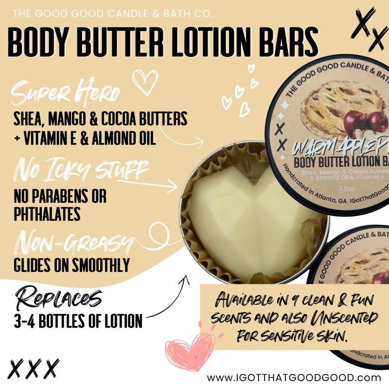 Crafted with love, our pure body butter bars are made from the most super ingredients on earth. Trendy & ultra moisturizing, our bars are a creamy & dreamy combination of Shea, Mango and Cocoa Butters with Vitamin E & Almond oil. Our silky, non-greasy formula replaces 3-4 bottles of lotion (made with mostly water and plastic) per 1.5oz tin. Remember* to use as a bar, pop bar out of tin and apply by hand. If your bar has softened from warmth, chill and then pop out and use as bar. To use as an oil, warm the contents. A little dab goes a long way! Ingrediants: Shea Butter, Cocoa Butter, Mango Butter, cera alba (beeswax) Almond Oil, Coconut Oil, Vitamin E, Arrowroot, Phenoxyethanol, Sorbic Acid, and Capryl Glycol, Fragrance Oil, Mica