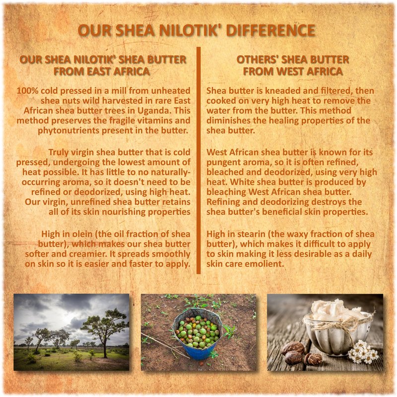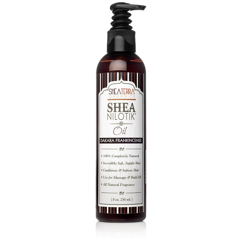- Pamper Your Skin - Believe it or not, your skin works hard! All day long your skin is punching the clock to protect you. While you’re getting your precious beauty sleep, it's working overtime to recover. Rare Ugandan Shea Nilotik’ Oil helps eliminate dry skin, while being gentle enough to be used as a facial cream thanks to its natural ability to retain moisture. Give your skin the spa treatment by using this Shea Terra healing oil to give your skin a break!