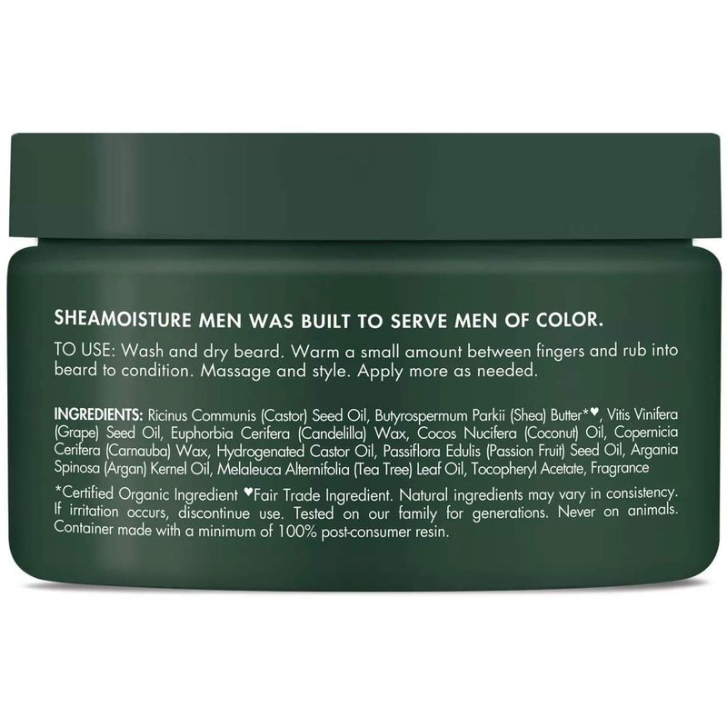 - RECOMMENDED USE: Warm a small amount between fingers and rub into beard to condition, manage and style. Add more as needed. For best results, cleanse first with Shea Moisture Beard Wash. May be layered over our Full Beard Detangler.