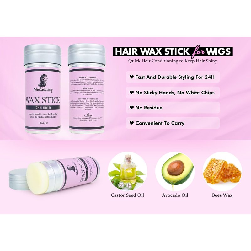 - 【Solt & Shiny Styling】 Shelace hair wax stick is a gentle farewell hairiness product, helps you smooth the hair. It can make your hair bright and shiny but not greasy or oily at all. Perfect your hair shape, not easy to loose. Our elastic wig band is great for laying edges/melting lace, plucking your hair and doing baby hairs.