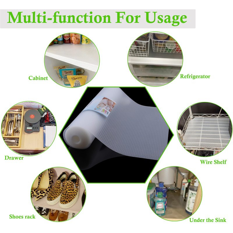 - 🗞️SAFETY MATERIAL - The shelf liner is made of premium quality food-graded EVA material (BPA free), non adhesive and durable without odor, safe to use. Could be contact with fruit and vegetable directly. This material has strong flexibility, chemical resistance which can be used for a long time. Eco-friendly necessities for home and kitchen!