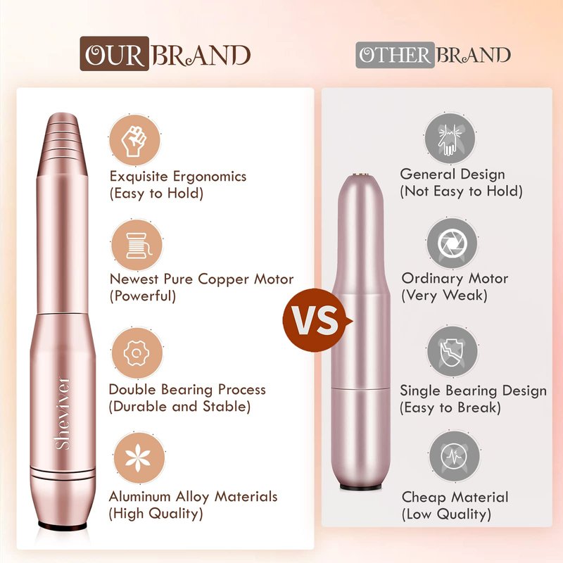 - 【High Quality & Aesthetic】The new compact and lightweight pen-shaped handle, which is ergonomic and more comfortable to hold, has been tested thousands of times. The stylish and streamlined electric nail file is made with high-tech process. At the same time, nail drill kit is equipped with 6 all-gold drill bits, a combination of art and beauty.