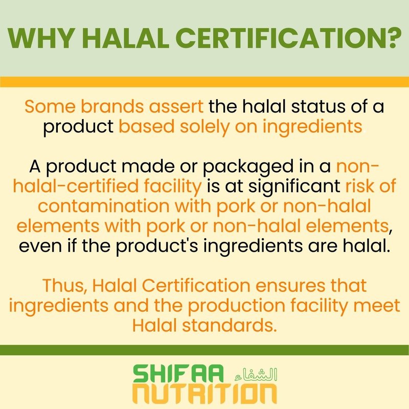 - QUALITY: Our Products are Halal Certified and Proudly Made In The USA, within An FDA-Registered Facility Under Strict GMP Guidelines. SHIFAA NUTRITION is A Brand You Can Trust Because We Strive For Quality.