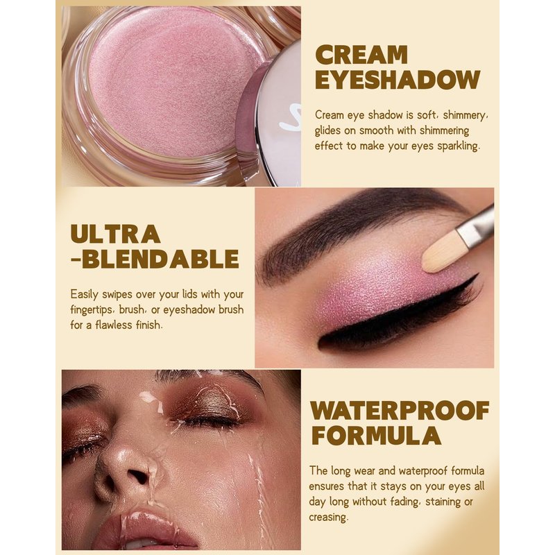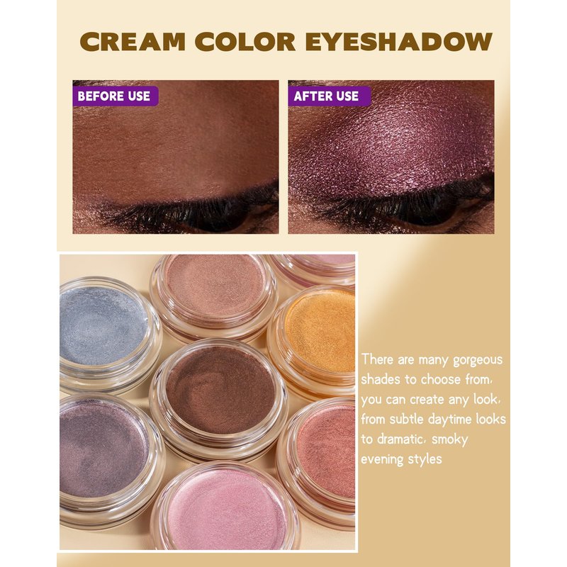 - Creamy & Easy-to-Blend - Our cream eye shadow is soft, shimmery, glides on smooth. It can apply seamlessly to the skin, gliding smoothly, won't flake or fade. The velvety, buildable eye formula easily swipes over your lids with your fingertips or brush for a flawless finish.